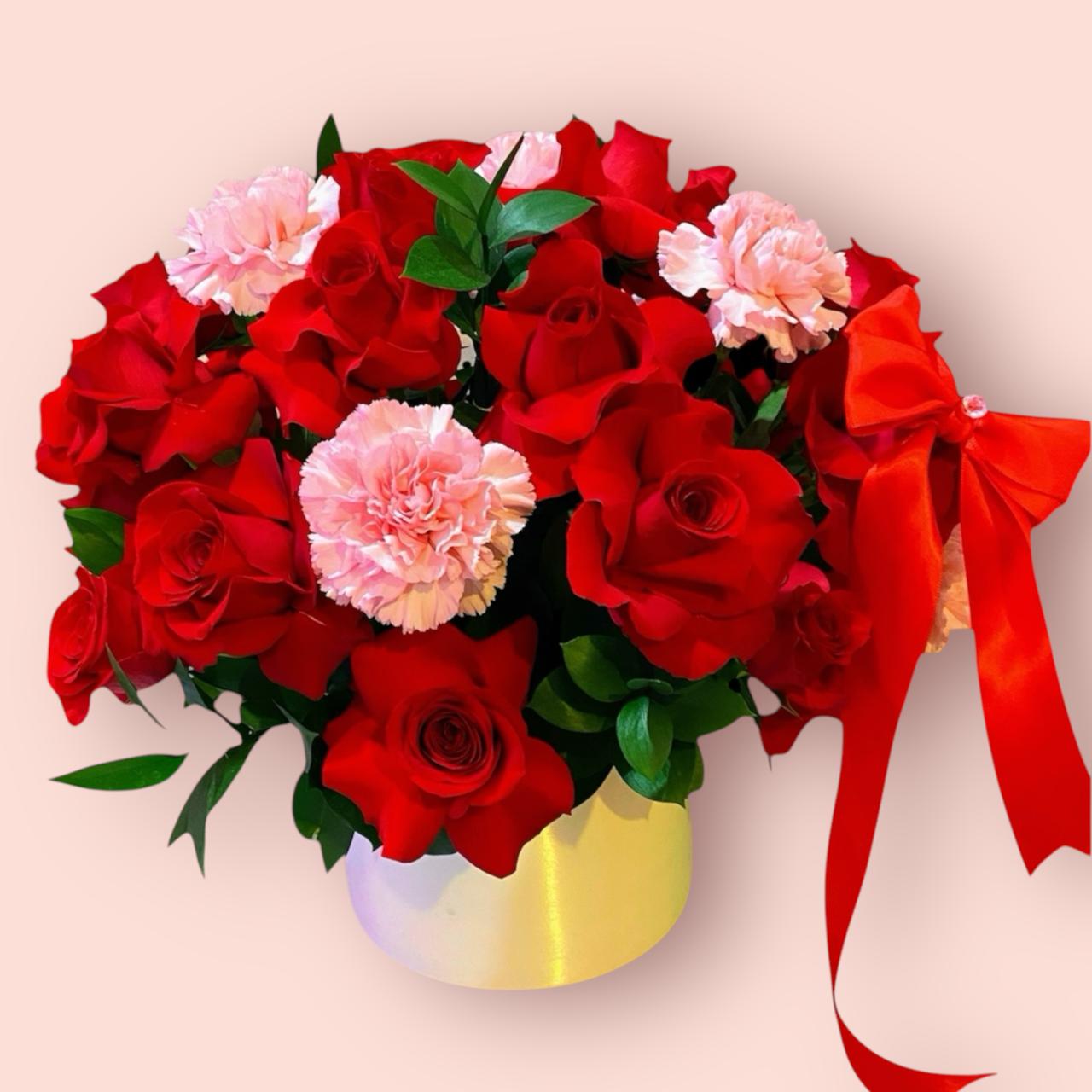 Un elegante arreglo en base de cerámica, compuesto por 24 rosas, acompañadas de claveles y ruscus, que juntos crean un diseño imponente, lleno de belleza y sofisticación. Perfecto para homenajear a esa persona especial con un detalle lleno de significado y amor.