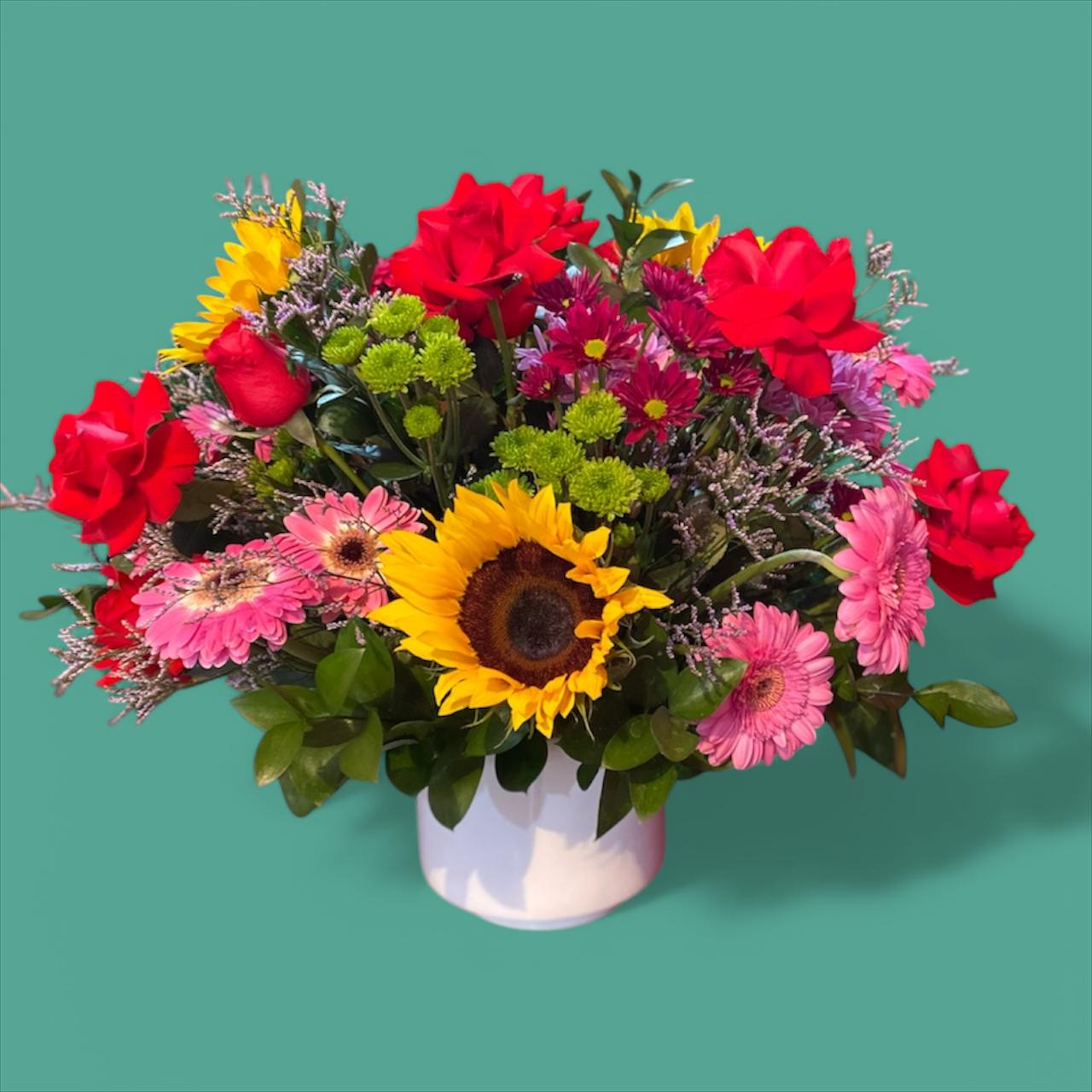 Un deslumbrante arreglo floral redondo, compuesto por 12 rosas frescas, 10 gerberas vibrantes, margaritas delicadas y girasoles radiantes, todo dispuesto en una elegante base de cerámica. Perfecto para llenar de color y frescura cualquier celebración, especialmente en un cumpleaños.