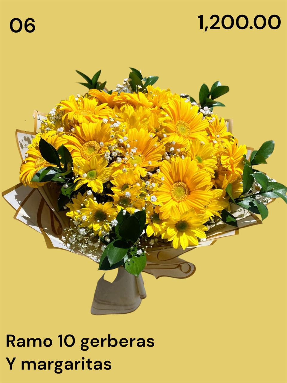💛 Ramo de 10 Gerberas con Margaritas, Baby Breath y Ruscus